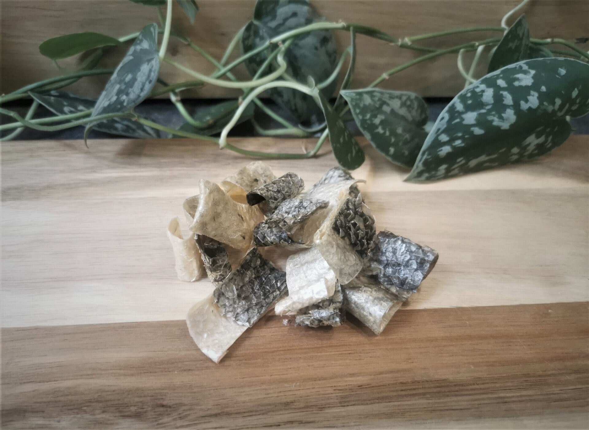 Deze kleine stukjes zalmhuid zijn een lekker tussendoortje. Geschikt voor al mijn hondenvriendjes, ook voor puppy's.
